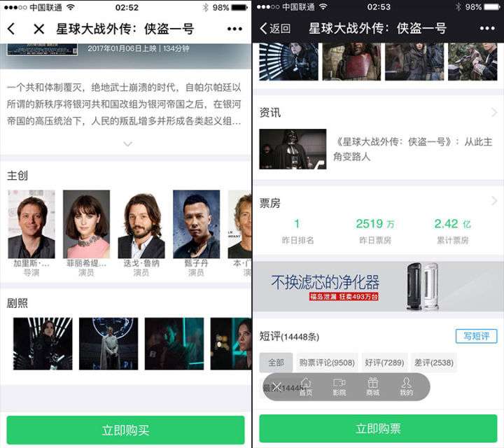 但是,现实可能并不会这么简单。我们发现,大部分小程序都只提供了其原生应用或 web 应用功能的一个子集。比如文章最早提到的微票儿的「电影演出赛事」小程序,与钱包里的 web 版本相比,UI 体验好了一点,但是功能远没有 web 版本来得丰富,也没有了 web 版本可以分享评论到朋友圈的能力。