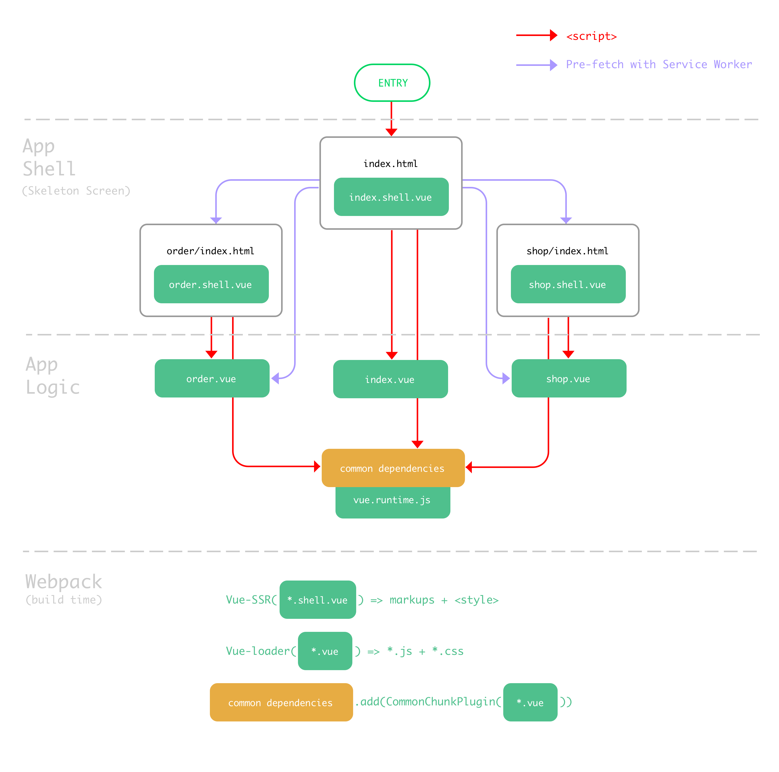 而 Vue 的多才多艺就在这时体现出来了,我们真的可以用 Vue.js 的服务端渲染模块 来实现这个想法,不过不是用在真正的服务器上,而是在构建时用它把组件的空状态预先渲染成字符串并注入到 HTML 模板中。你需要调整你的 Vue 组件代码使得它可以在 Node 上执行,有些页面对 DOM/BOM 的依赖一时无法轻易去除得,我们目前只好额外编写一个 *.shell.vue