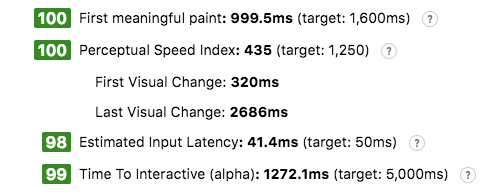 根据 Google 推出的 Web 性能分析工具 Lighthouse(v1.6),在模拟的 3G 网络下,用户的初次访问(无任何缓存)大约在 2 秒左右达到“可交互”,可以说非常不错。而对于再次访问,由于所有资源都直接来自于 Service Worker 缓存,页面可以在 1 秒左右就达到可交互的状态了。